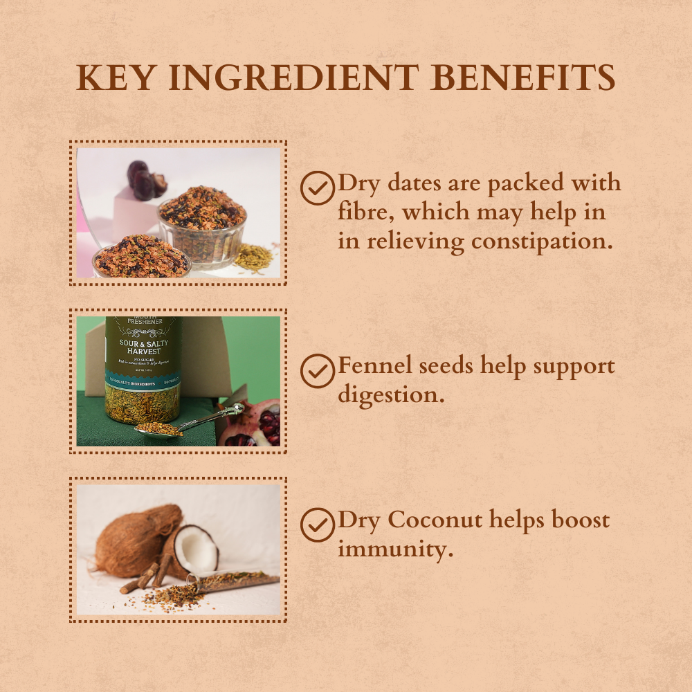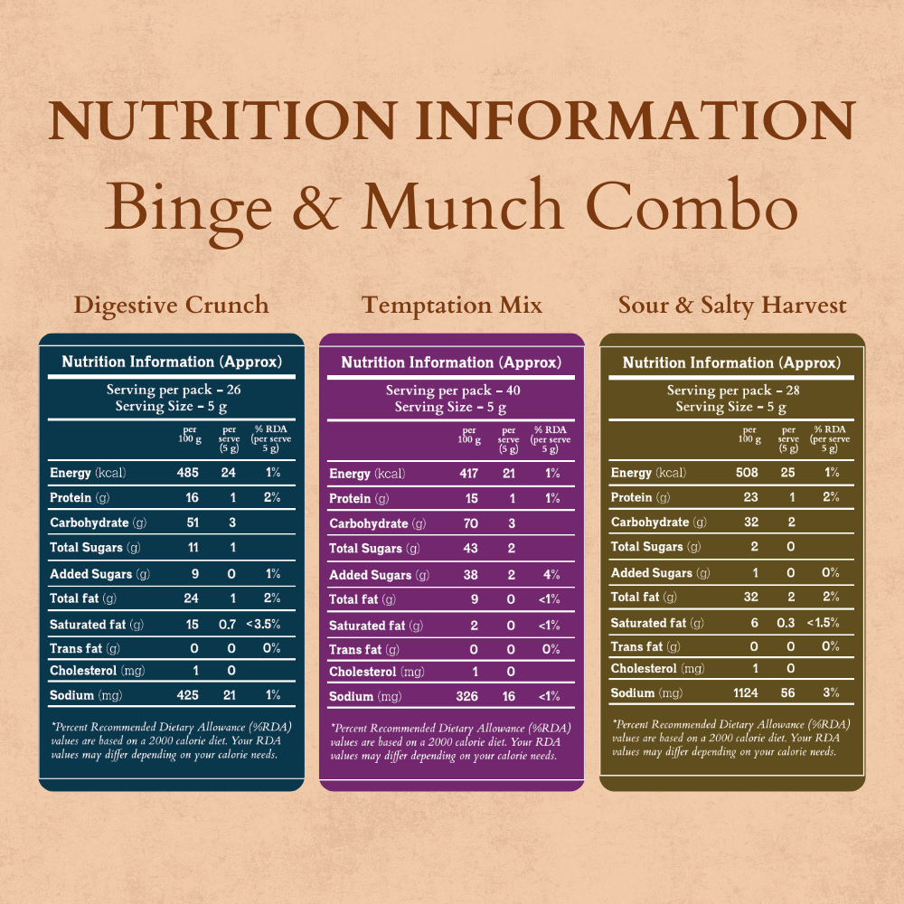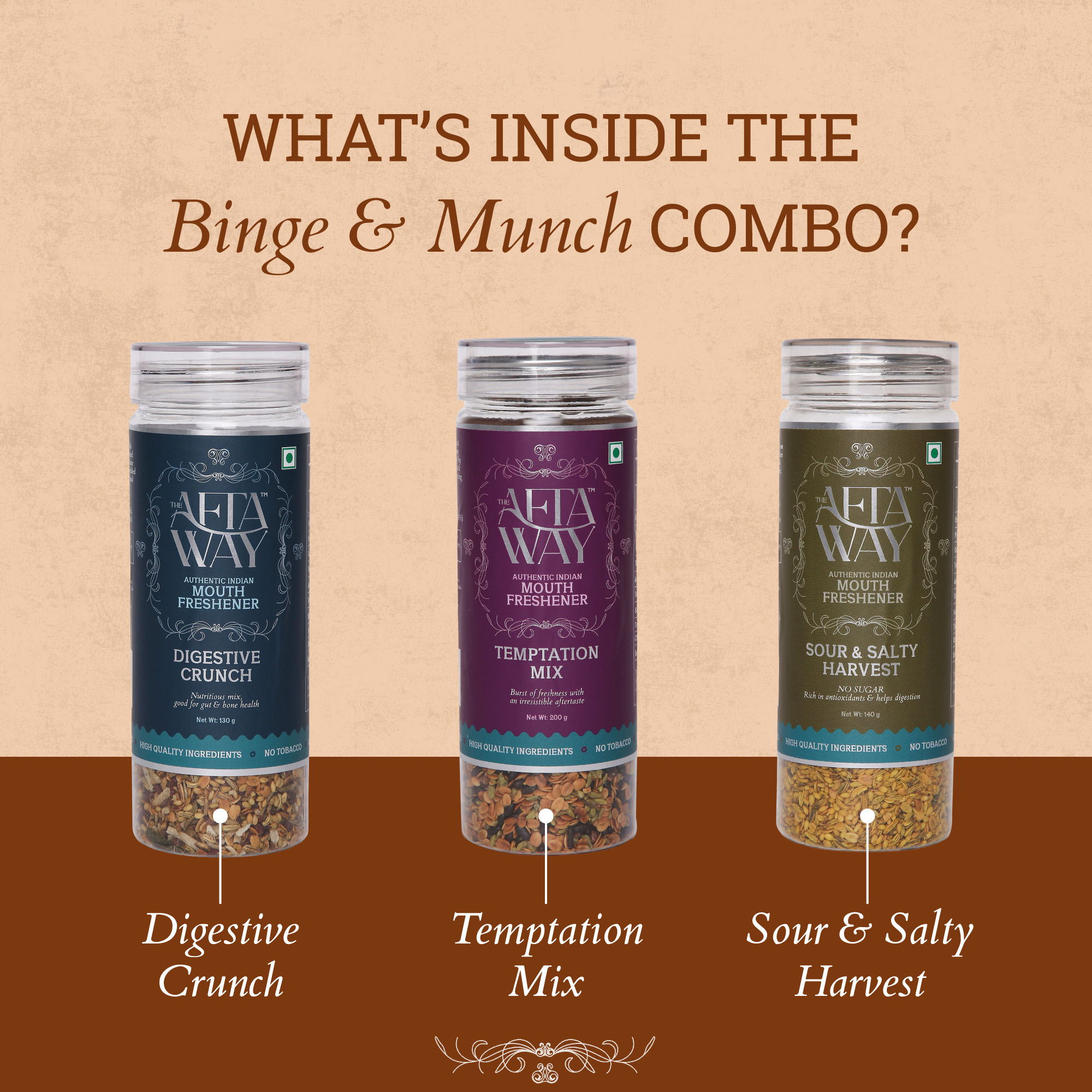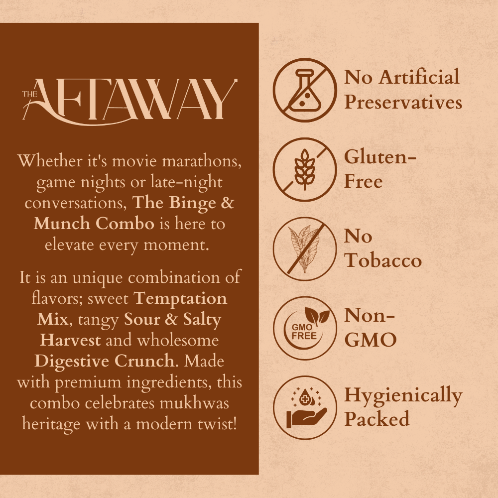 Whether it's movie marathons, game nights or late-night conversations, the Binge & Munch Combo is here to elevate every moment. It is an unique combination of flavors; sweet Temptation Mix, tangy Sour & Salty Harvest and wholesome Digestive Crunch. Made with all-natural ingredients, this combo celebrates mukhwas heritage with a modern twist!