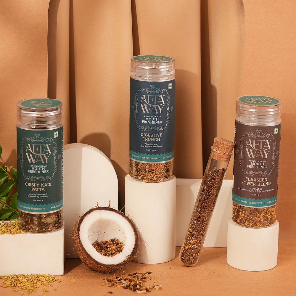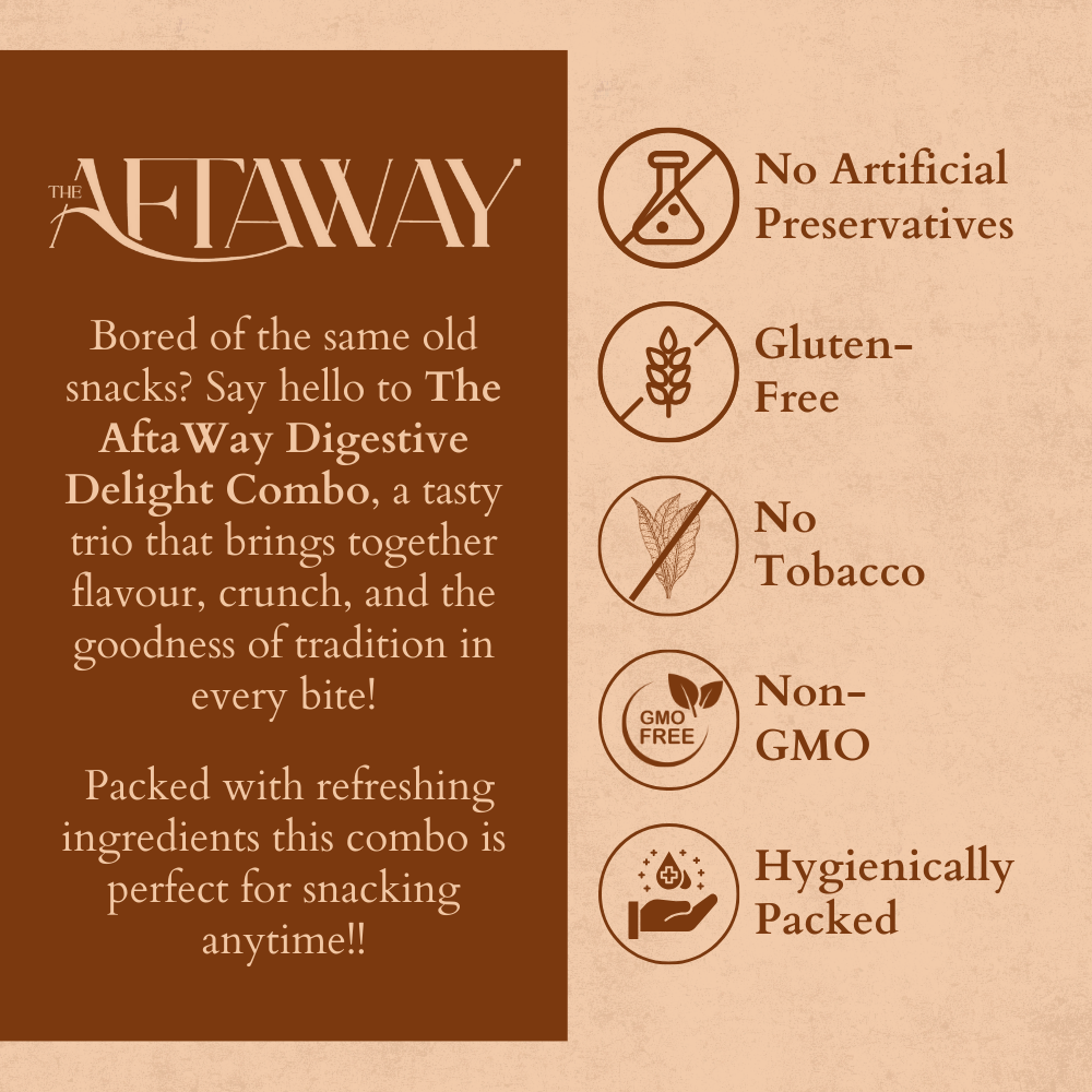 Bored of the same old snacks? Say hello to the AftaWay Digestive Delight Mukhwas Combo, a tasty trio that brings together flavour, crunch, and the goodness of tradition in every bite! Packed with refreshing ingredients this combo is perfect for snacking anytime!