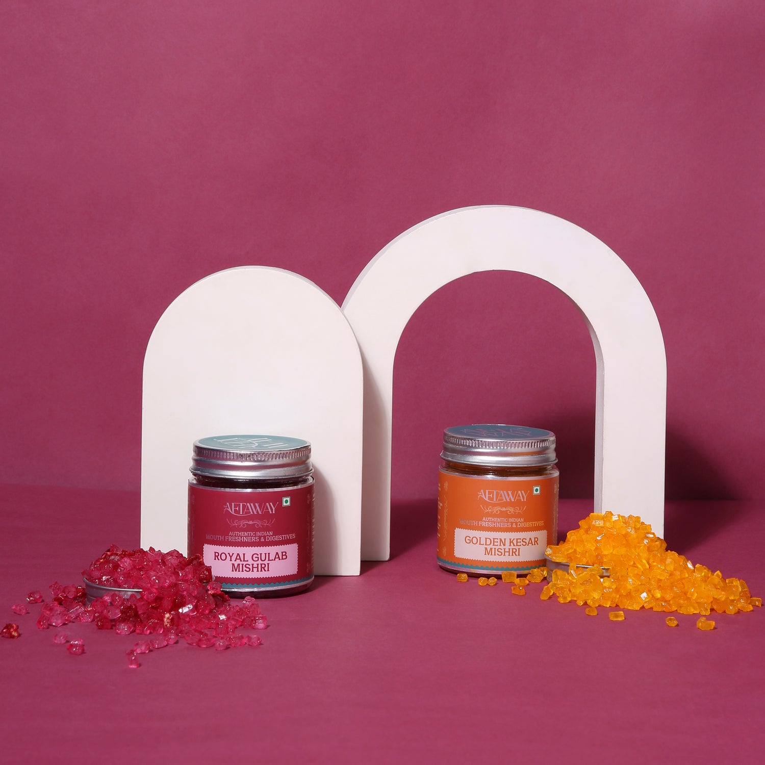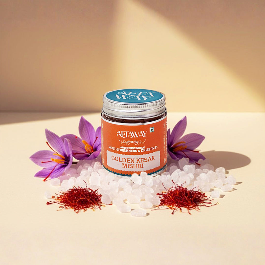 A premium blend of pure sugar crystals infused with real saffron leaves. Each piece carries a subtle aroma and a golden glow, making it as delightful to see as it is to taste.