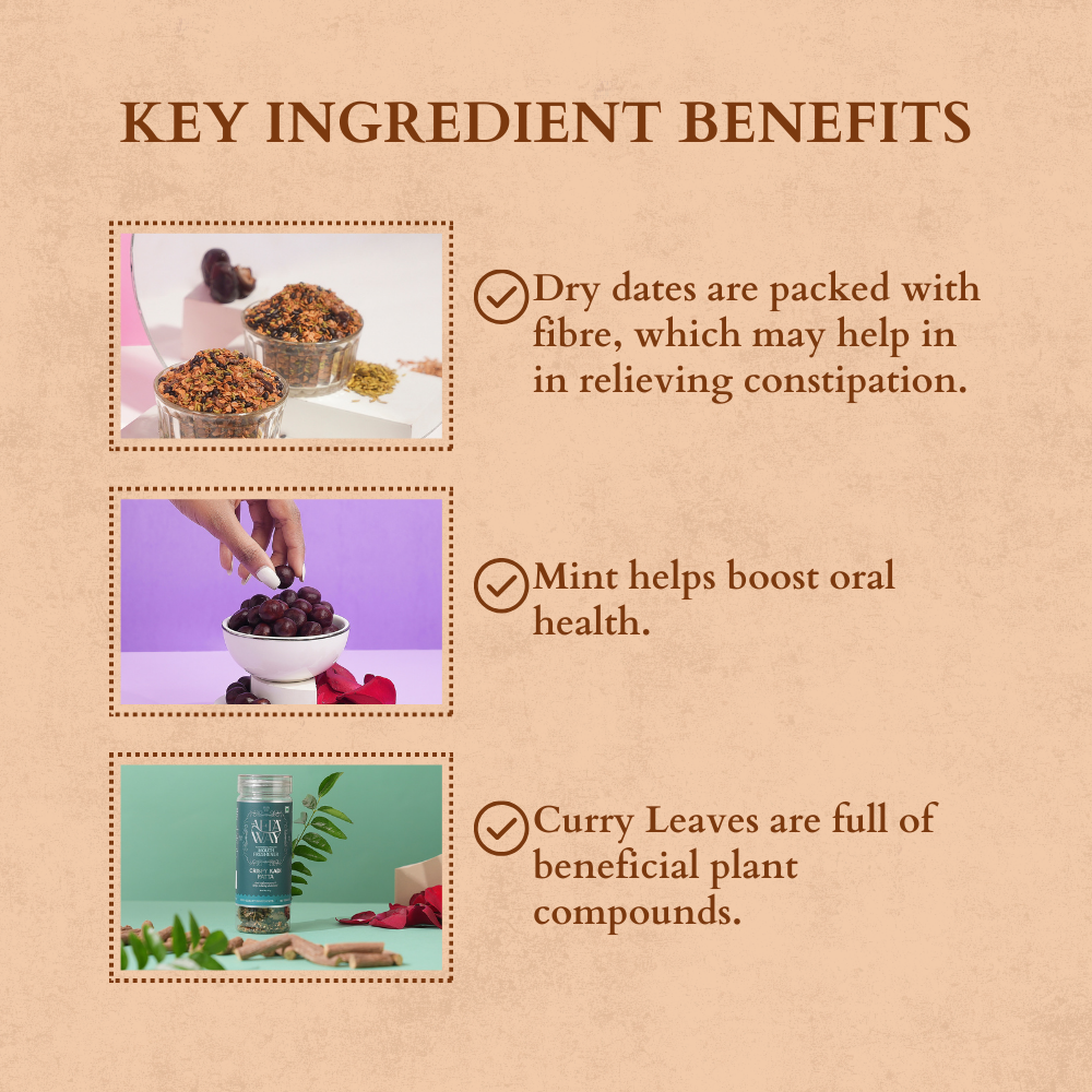 Fennel Seeds, Dry Dates, Gulkand, Mint, Sugar, Curry Leaves, Jethimadh Powder, Coriander Seeds, Sesame Seeds, Mixed Seeds
