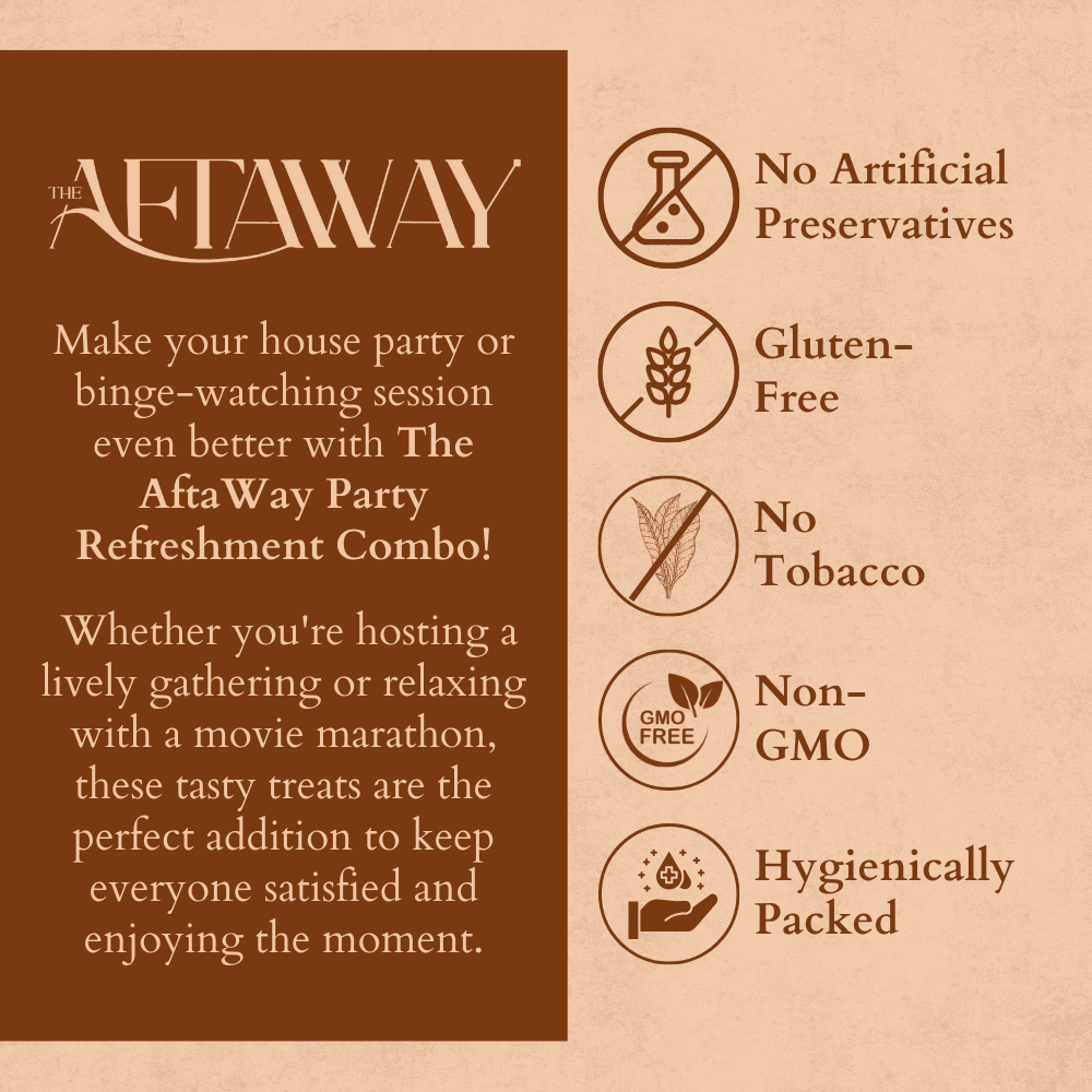 Make your house party or binge-watching session even better with the AftaWay Party Refreshment Combo! Whether you're hosting a lively gathering or relaxing with a movie marathon, these tasty treats are the perfect addition to keep everyone satisfied and enjoying the moment.
