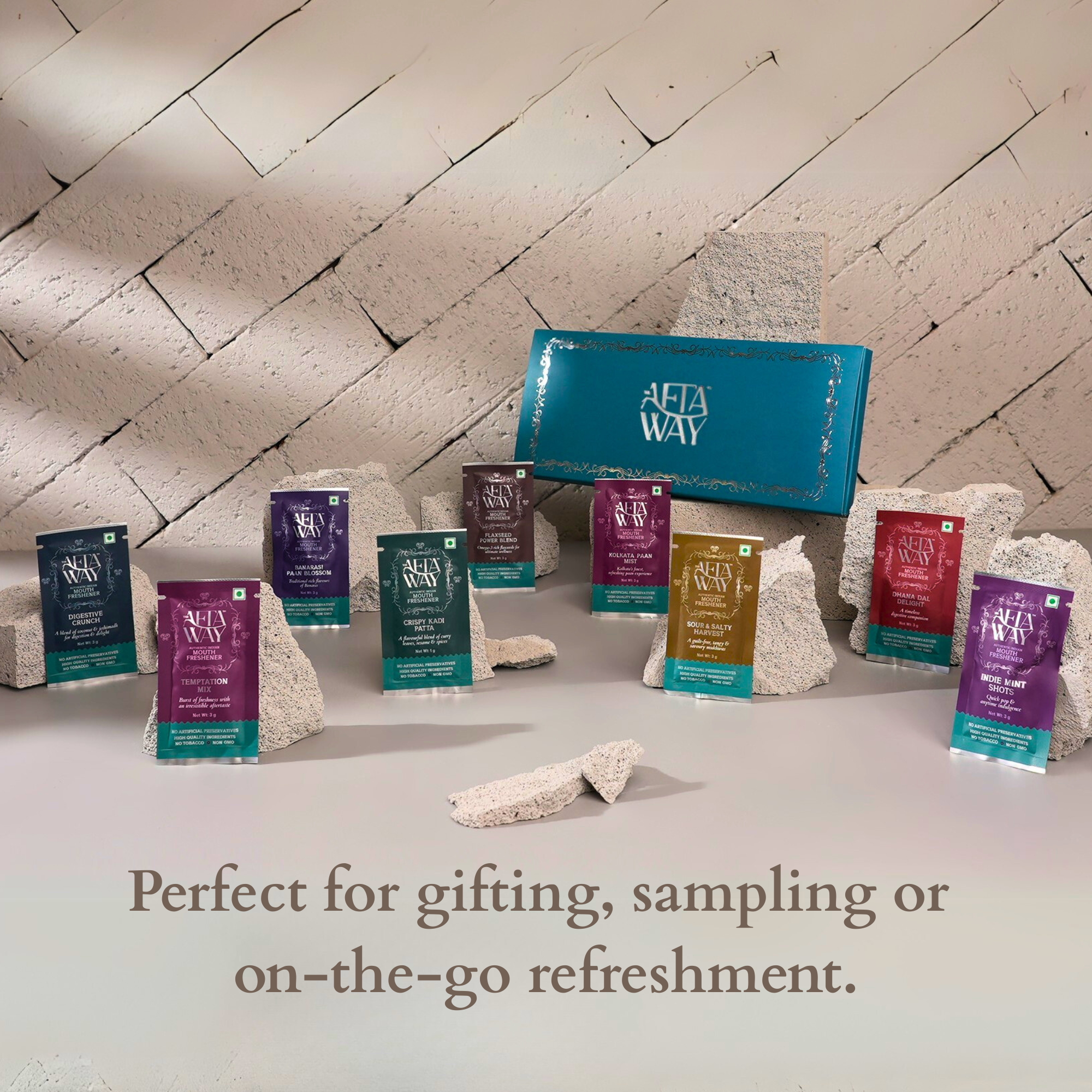 Inside the Aftaway Assortment Box, you'll find individual sachets of all our signature blends: No compromises on taste or refreshment. It’s our way of letting you explore without having to choose just one.